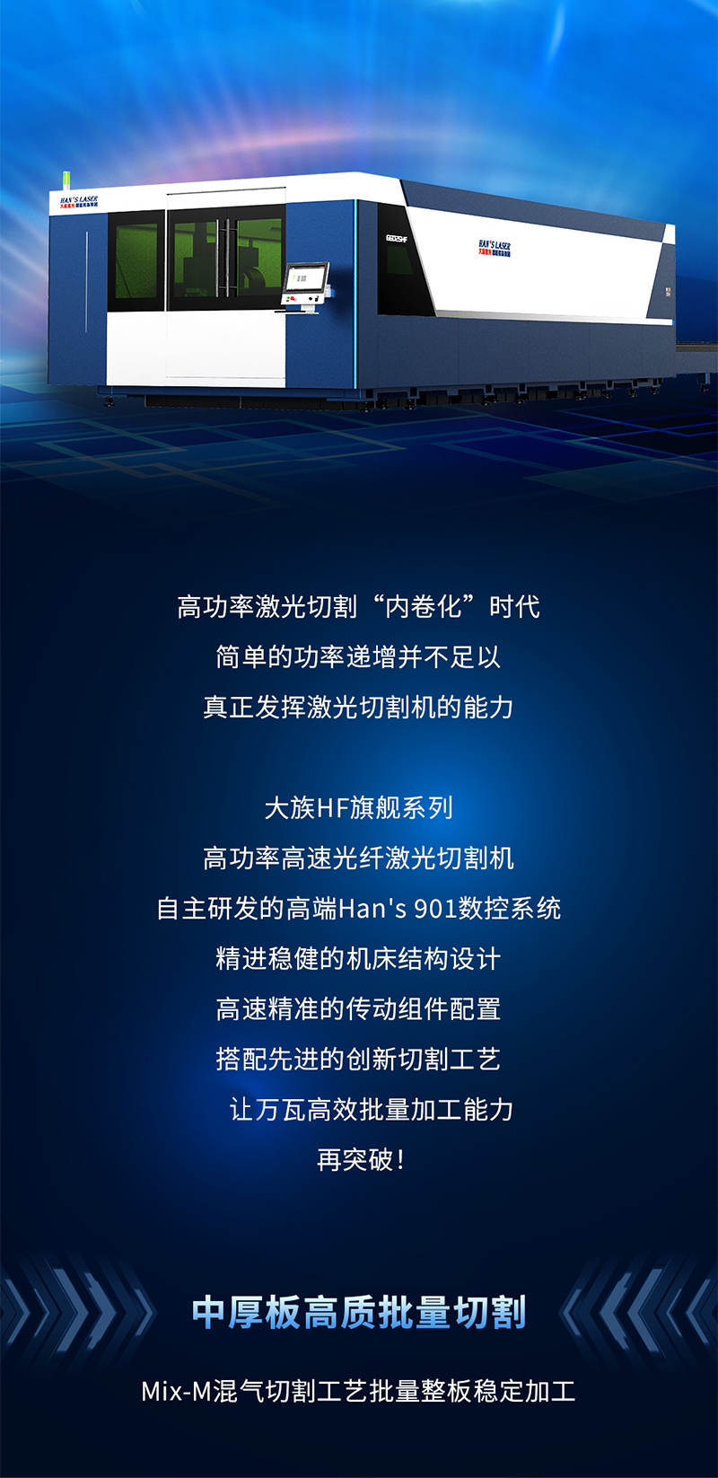 HF系列光纖激光切割機最大程度地發揮數千瓦乃至上萬瓦光纖激光器的切割速度,為您提供最高效的薄、中、厚板加工解決方案。